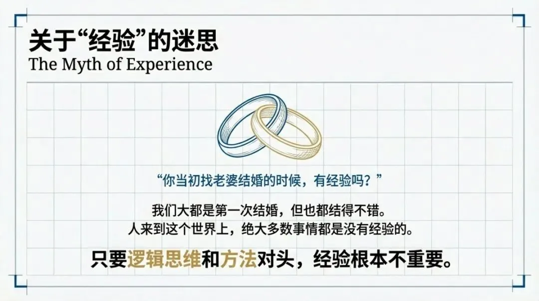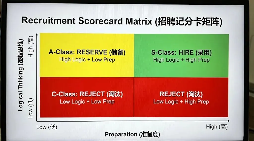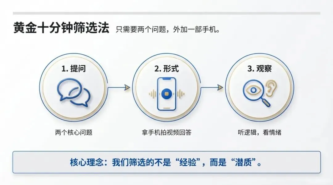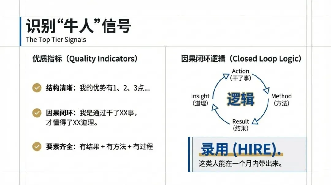 寻找“牛人”信号:优质应聘者具备因果闭环逻辑(道理 + 行为 + 方法 + 结果) 。他们能清晰地说出:“我干了 XX 事,懂得了 XX 道理” 。