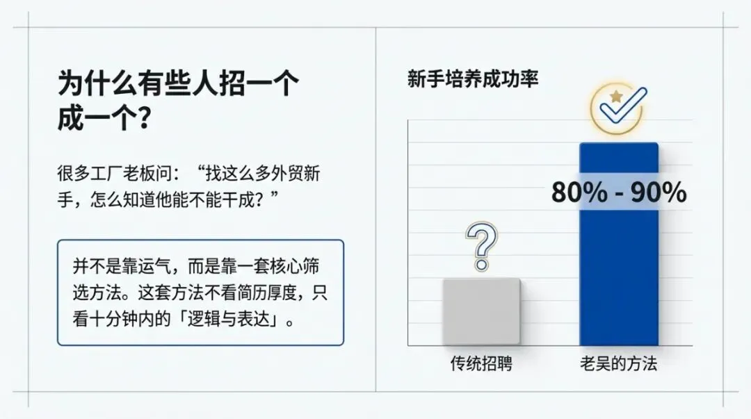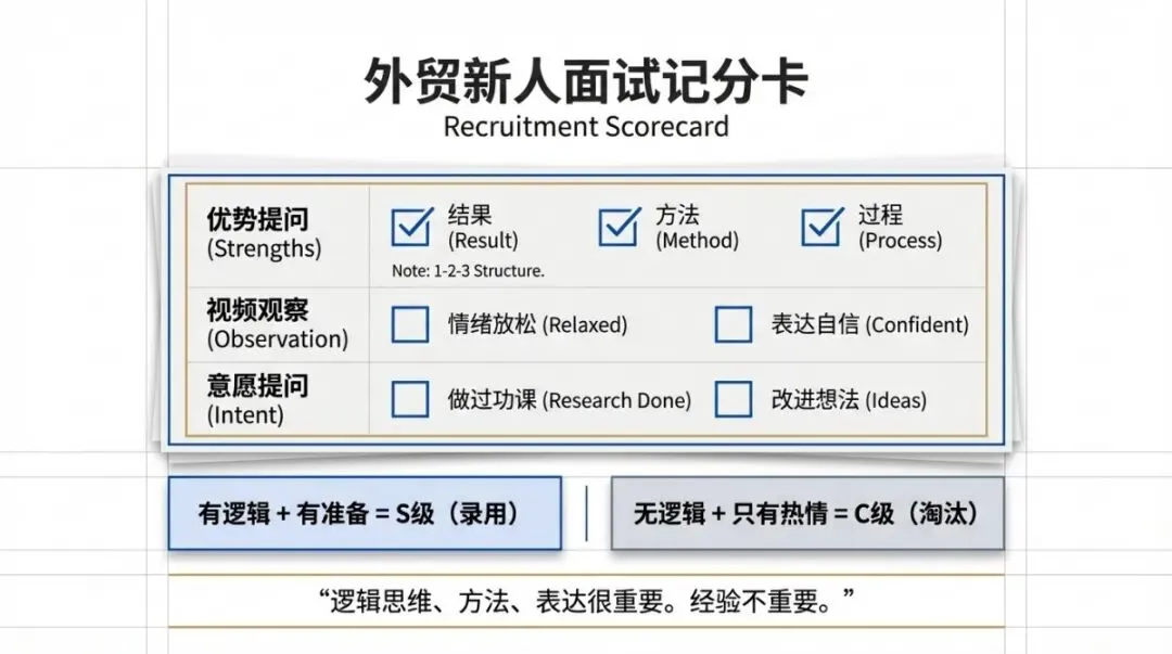 核心结语:招聘外贸销冠,看的是脑子里的“操作系统”是否先进。表达自信、逻辑清晰的人,才是真正能帮你拿下订单的“牛人” 。