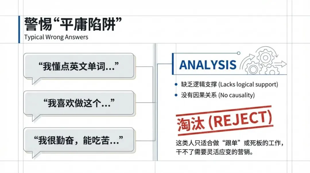 警惕“平庸陷阱”:只会说“我很勤奋”、“我懂英文”、“我喜欢外贸”的人,通常缺乏逻辑支撑,只适合做死板的跟单,干不了灵活的营销 。