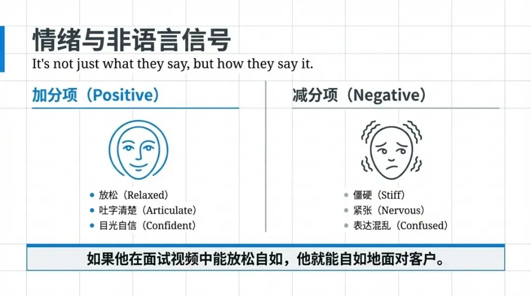映射机制:视频表现放松对应客户开发能力,回答条理清晰对应业务谈判能力 。