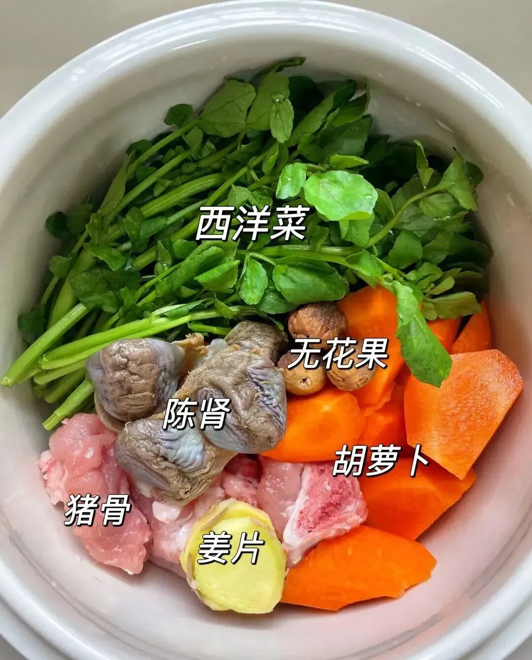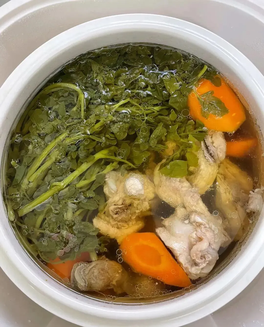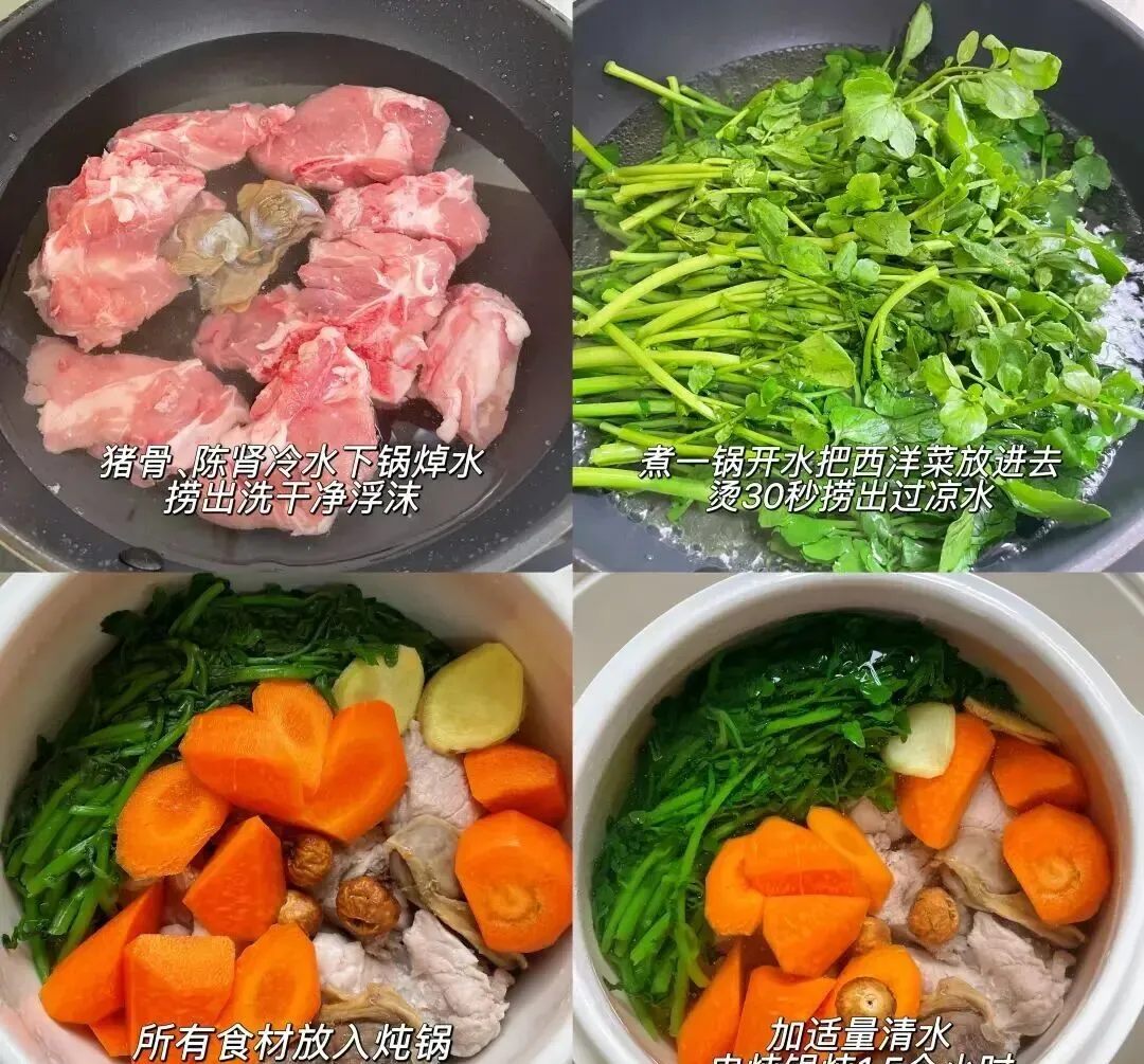 其实这道汤做起来不难 , 食材也简单 , 西洋菜配点排骨或者瘦肉 , 再加几颗蜜枣 , 大火煮开转小火慢慢煲。 关键是西洋菜一定要煲久一点 , 煲到软软烂烂的 , 那个味道才对 , 汤喝起来甘甜甘甜的 , 润得很。