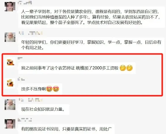 第一,提升就业竞争力。不管是农业科研单位、农业管理单位、合作社、农资公司、合作社、种植大户,必然要有一些岗位是需要专业的技术人才担任的,那么这些岗位选人的时候,有证件当然是有优势。