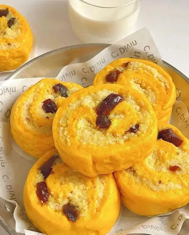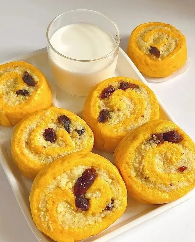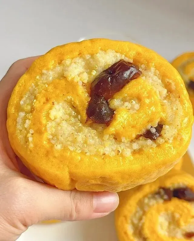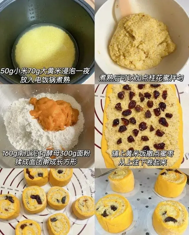 我要来了配方 , 回家加了点南瓜 , 做成黄米南瓜卷 , 全家都抢着吃。