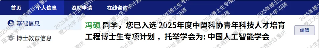 近日,2025年中国科协青年科技人才培育工程博士生专项计划入选名单公布,重庆理工大学原子/近原子尺度可控制造技术与装备团队的博士研究生冯硕同学入选该专项计划。