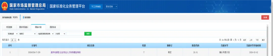 2026年2月2日,国家标准化管理委员会下达推荐性国家标准计划,由全国两化融合标委会数字化转型标准工作组归口管理,北京国信数字化转型技术研究院牵头研制的《数字化转型 企业专业人才体系建设导则》(计划号:20260334-T-339)国家标准正式获准立项。