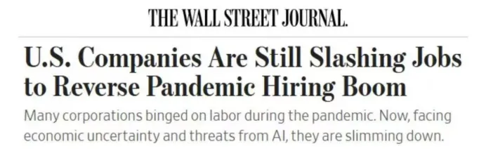 至少在目前,裁员的核心原因仍然是企业臃肿。在2020年和2021年招聘增幅最大的行业科技业和物流业,如今也成为裁员最集中的领域。根据就业安置公司查林杰、格雷与圣诞节公司(Challenger, Gray & Christmas) 的数据2025年美国雇主宣布裁减岗位120 万个,为2020年以来的最高年度水平。其中,科技行业以 154,445个岗位裁减位居所有私营行业之首,其次是仓储行业,裁减 95,317 个岗位。