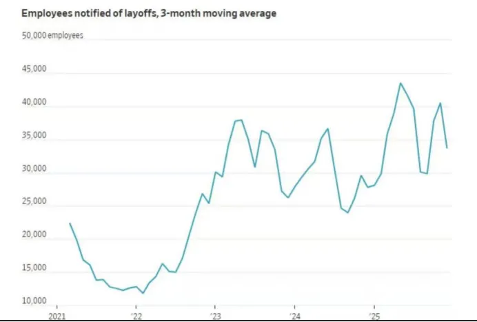—些经济学家和首席执行官认为,随着人工智能应用的加速,美国经济或许正处在新一轮企业裁员浪潮的开端。高盛的经济学家估计,2025年,人工智能在受其影响最深的行业中,每月造成5,000至1万个净岗位流失,并预计这一数字将在2026年上升至每月2万个。该行经济学家在近期的一份报告中写道,长期来看,人工智能可能取代当前6%至7%的工作岗位,尽管它也可能通过推动经济增长创造新岗位。