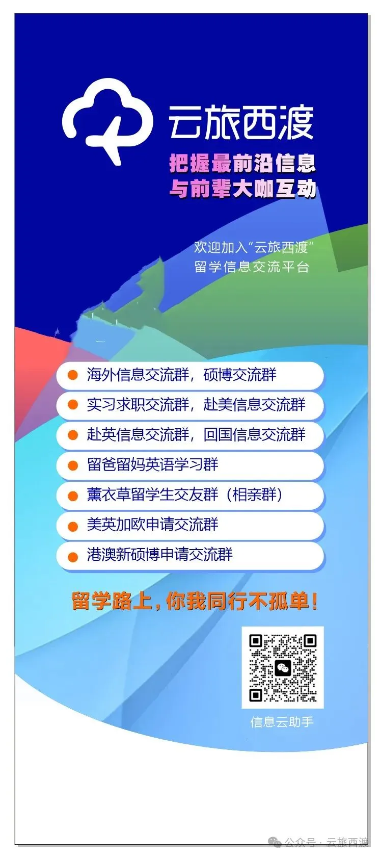想了解更多留学资讯,关注云旅西渡微信公众号,或扫描下方二维码进群,加入留学生家长大家庭,一起为留学生们保驾护航!