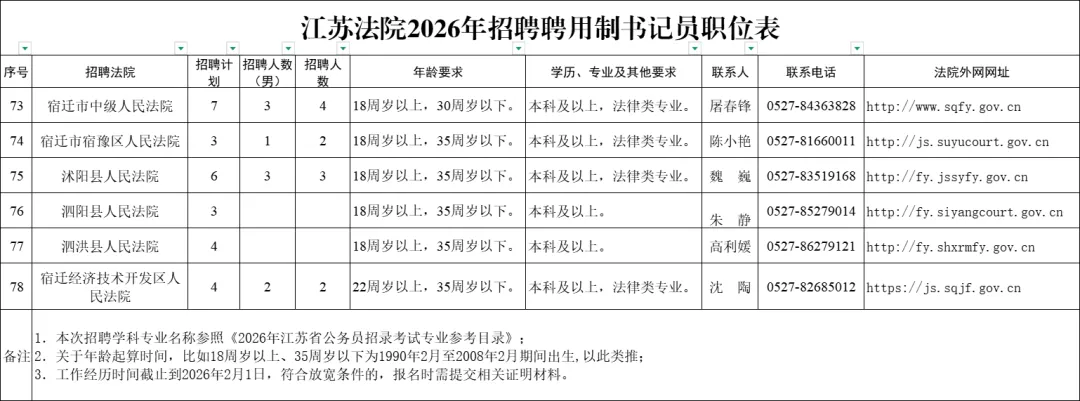 根据工作需要,江苏法院面向社会公开招聘聘用制书记员。其中,宿迁法院6家法院面向社会公开招聘,现将有关事项公告如下:(一)报考具体条件及要求