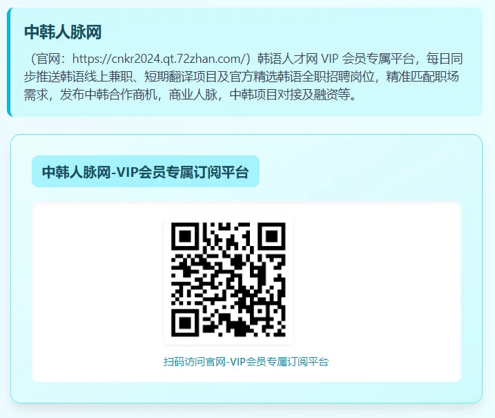 2.中韩人脉网:(https://cnkr2024.qt.72zhan.com/)韩语人才网VIP求职会员专属订阅平台,订阅每日韩语线上兼职,韩语短期翻译项目推送以及官方精选韩语全职招聘岗位;