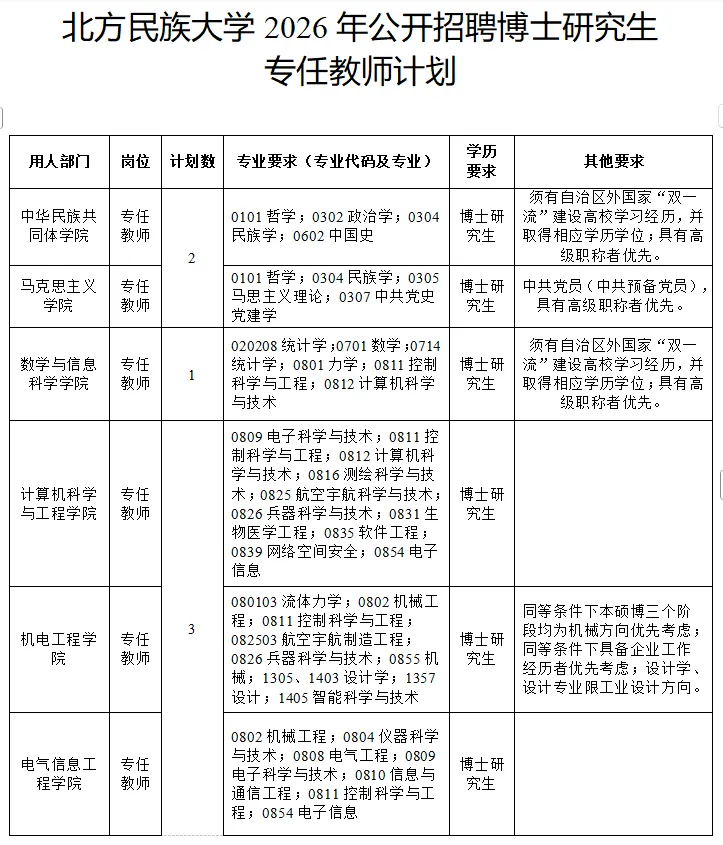 2026年北方民族大学公开招聘博士研究生专任教师计划15名,具体招聘岗位及条件详见附件:《北方民族大学2026年公开招聘博士研究生专任教师计划》。