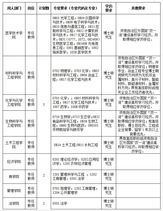 4.具备岗位所需的文化程度、专业知识、业务技能及其他条件。须在2026年12月31日(含)之前取得毕业证及学位证书。同时,国(境)外毕业生的学历学位证书须在2026年12月31日(含)之前经教育部学历学位认证。因学科发展需要,中华民族共同体学院、数学与信息科学学院、医学技术学院、材料科学与工程、化学与化学工程学院、生物科学与工程学院、土木工程学院博士研究生专任教师岗位应聘人员须有自治区外国家“双一流”建设高校学习经历,并取得相应学历学位。