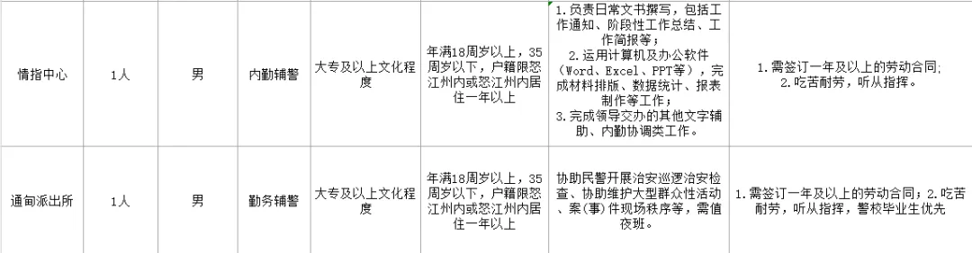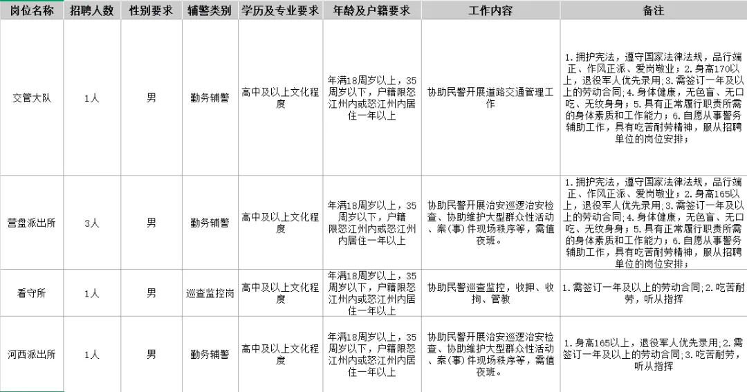 本次招聘辅警8名,分6类岗位,招聘不足时从符合条件的考生中调剂,具体岗位信息如下: