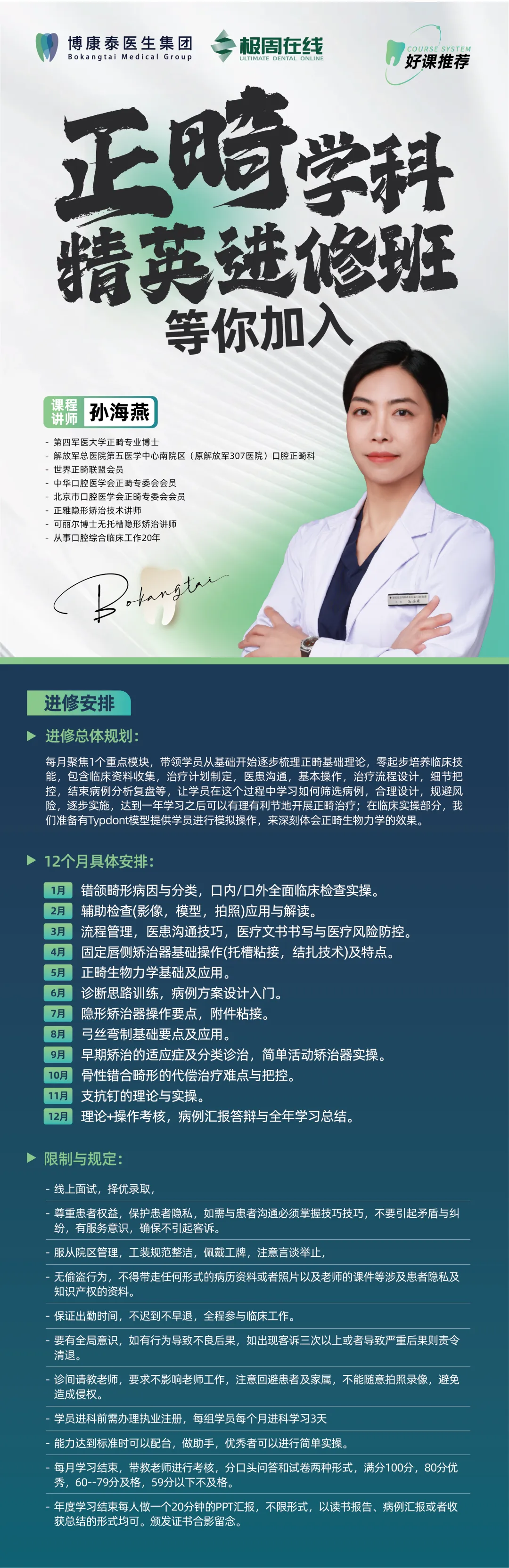 博康泰正畸学科精英进修班以“零起步培养临床型正畸精英” 为核心目标,依托孙海燕博士 20 年口腔综合临床工作经验与正畸专业博士的学术背景,设计了12 个月循序渐进、理论 + 实操深度融合的学习规划,从基础理论到临床实操,从病例分析到风险防控,全方位打造符合市场需求的正畸专业人才。(一)学习规划核心逻辑:从基础到临床,循序渐进构建能力体系