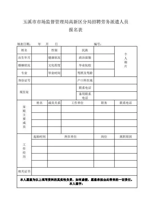 附:《玉溪市市场监督管理局高新技术产业开发区分局招聘劳务派遣人员报名表》