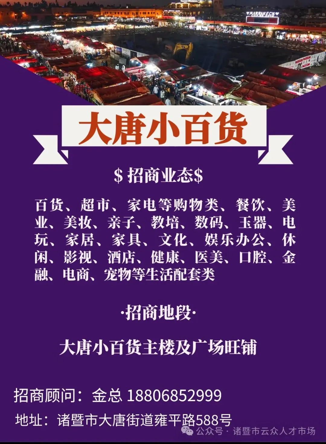 诸暨市大唐街道雍平路588号大唐小百货市场内4000平方左右的场地出租,1楼1000平方,2楼2000平方,3楼1000平方,交通方便,商业发达,人流量众多,适合开各类服务业,如酒店,浴场,台球,网吧等行业,有意向合作者请联系