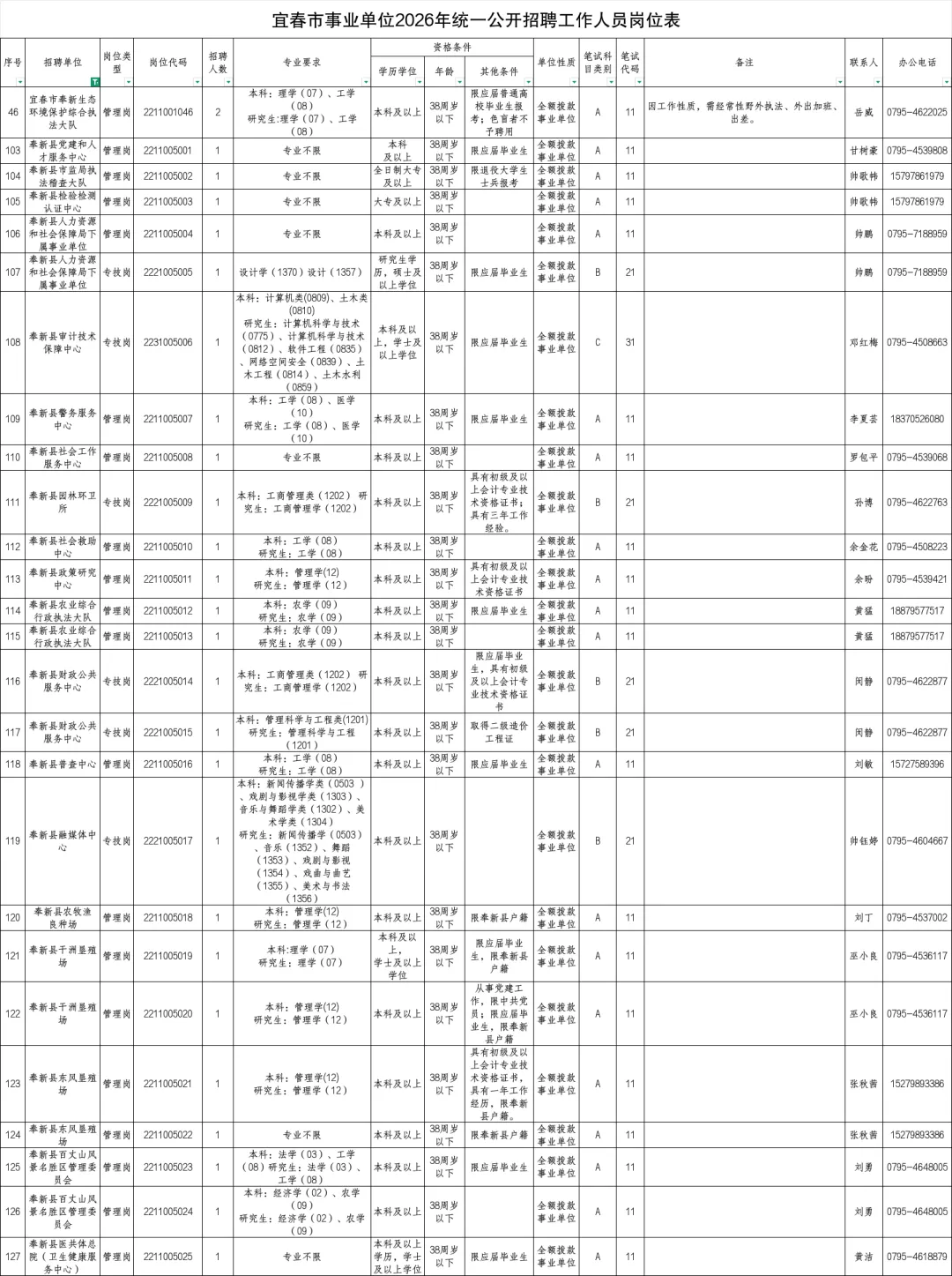 本次宜春市事业单位招聘计划共343名,具体招聘岗位及要求详见《宜春市事业单位2026年统一公开招聘工作人员岗位表》(附件1)、《宜春市2026年公开招聘卫生专业技术人员岗位表》(附件2)。
