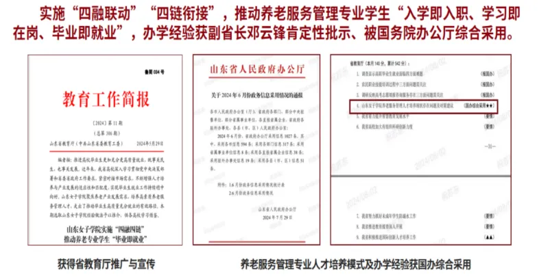 在学校教育中,注重打造“大思政课”,将思政教育与社会实践相结合,让学生在服务地方教育事业的过程中,增强社会责任感和使命感,培养正确的世界观、人生观和价值观。学院人才培训模式被央视新闻1+1、《光明日报》、新华网等30多家媒体报道,山东省教育厅发布《山东女子学院实施“四融四链”推动养老服务管理专业学生“毕业后即就业”》教育简报。