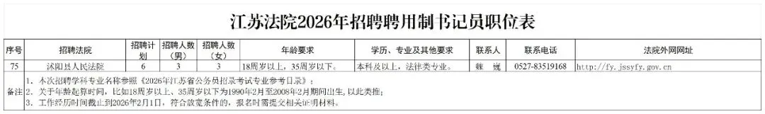 根据工作需要,江苏法院面向社会公开招聘聘用制书记员202名,其中,沭阳法院招聘书记员6名,相关要求详见《江苏法院2026年面向社会公开招聘聘用制书记员公告》。