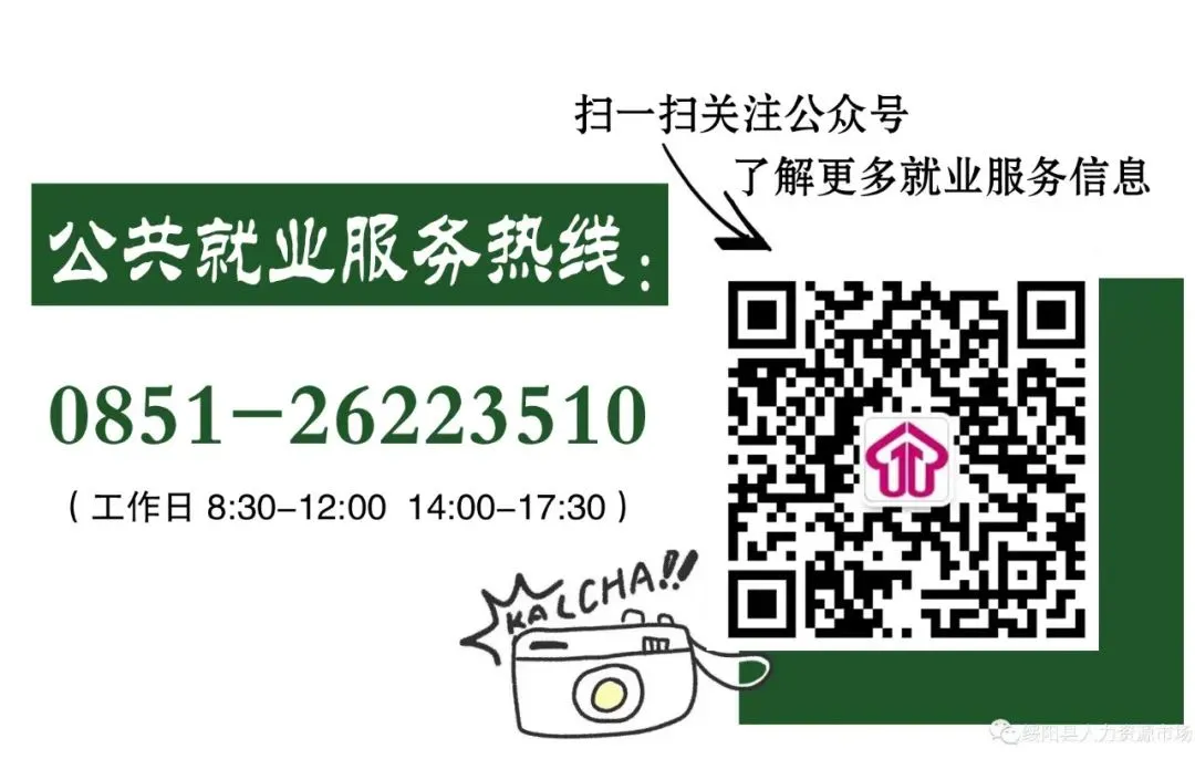 温馨提示:按照人社部有关规定,用人单位招聘不得以任何名义向应聘者收取培训费、押金、服装费等,请注意甄别,谨慎选择,以免受骗上当。举报投诉电话:0851-26223510 。“绥阳县人力资源市场”微信公众号平台面向社会提供免费发布企业招聘信息渠道,如需发布招聘信息的企业可直接在后台私信“招聘+岗位需求+联系电话+公司营业执照+法人身份证照片”,工作人员将尽快对接发布。