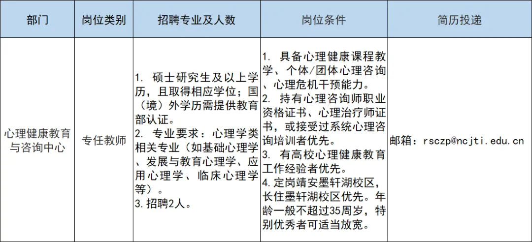 邮件格式:专任教师+心理健康教育与咨询中心+毕业院校+姓名学历+所学专业(例如:专任教师+心理健康教育与咨询中心+某某大学+李某某硕士+基础心理学专业)。请在简历中列出您的工作经历及科研业绩。