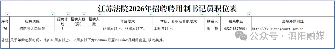 根据工作需要,江苏法院面向社会公开招聘聘用制书记员202名,其中,泗阳县人民法院招聘3名。现将有关事项公告如下: