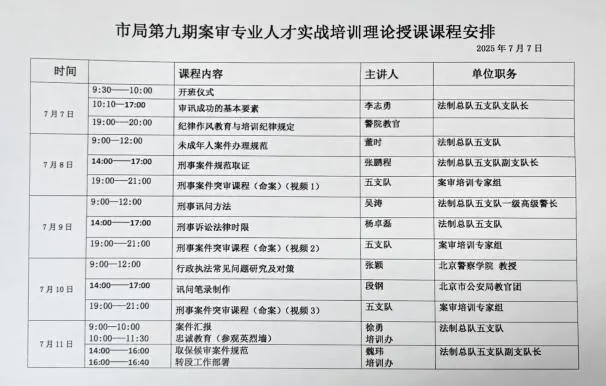 因配合市局九三阅兵与国庆安保任务,本次开班提前至2025年7月进行。在培训理论授课过程中,聘请市局教官团教官,警察学院教授,法制总队五支队主要领导、现职领导,以及长期奋战在案审一线的专家,为参训学员们带来了一节节精彩纷呈,干货满满的课程。