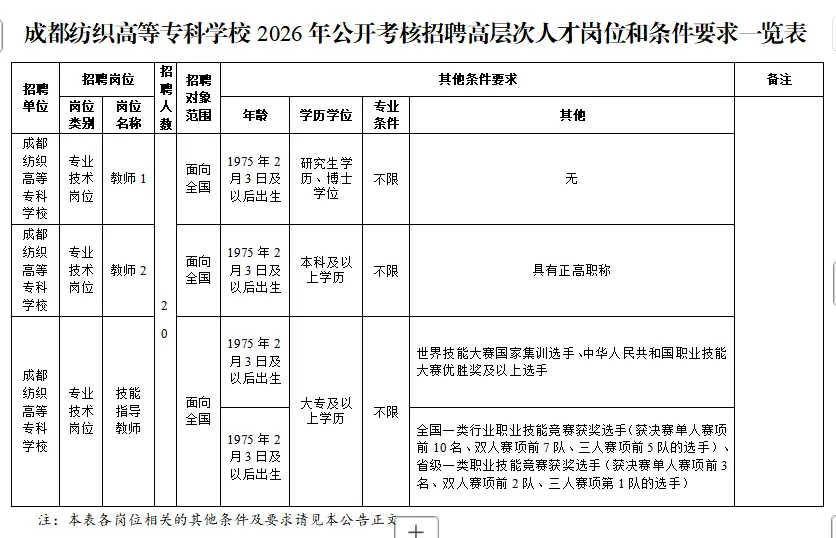面向全国招聘完全符合《成都纺织高等专科学校2026年公开考核招聘高层次人才条件要求一览表》(含表注,以下简称《岗位和条件要求一览表》)相关岗位条件要求和本公告其他要求的人员。其中,2026年高校应届毕业生必须在2026年12月31日前取得符合岗位条件要求的毕业证等证书,并凭证书办理确认等手续;其他报考者必须在面试资格审查前取得符合岗位条件要求的国家承认学历的毕业证、学位证等证书。未在规定时间内取得并提供有关证书的,视为报考者自动放弃,责任自负。2026年12月31日之后毕业的全日制在读生不属于此次公招的范围。