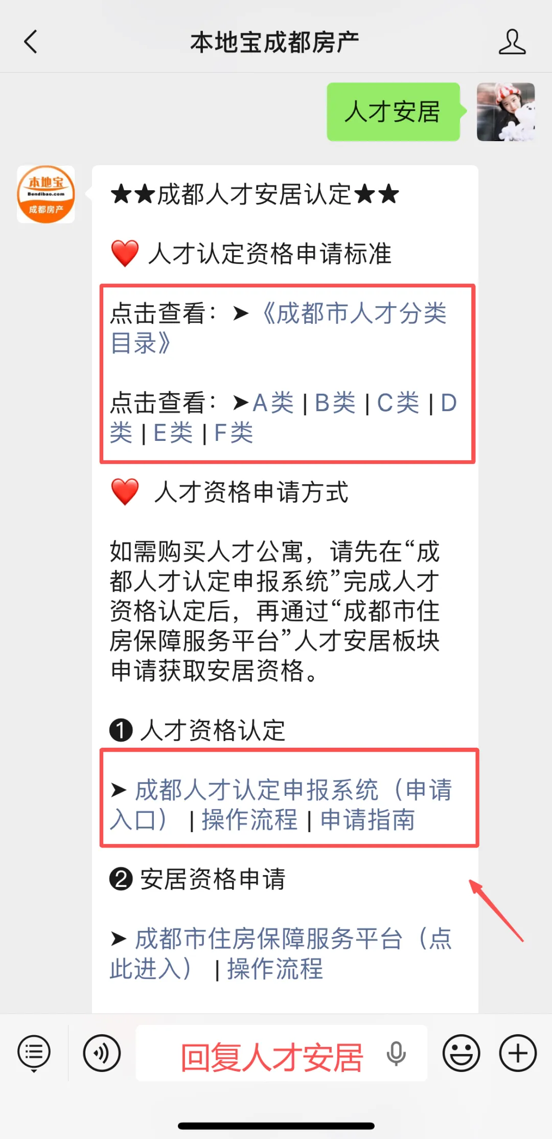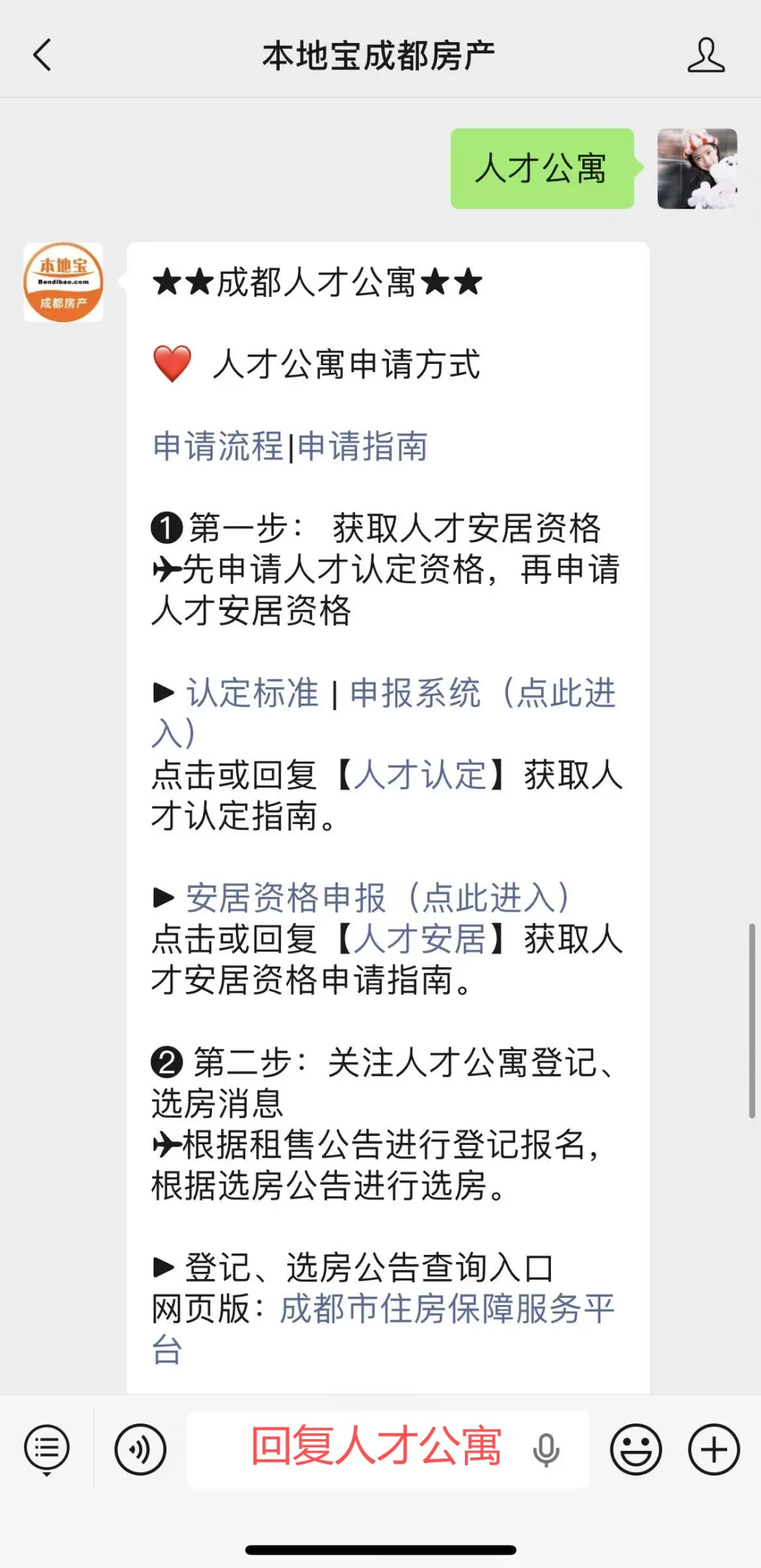 进入【本地宝成都房产】公众号,在对话框回复【人才公寓】直达最新人才公寓项目登记入口、A-F类人才认定入口。在对话框发送【人才安居】,还可直达人才安居资格申请入口,还能查看各区人才安居政策。