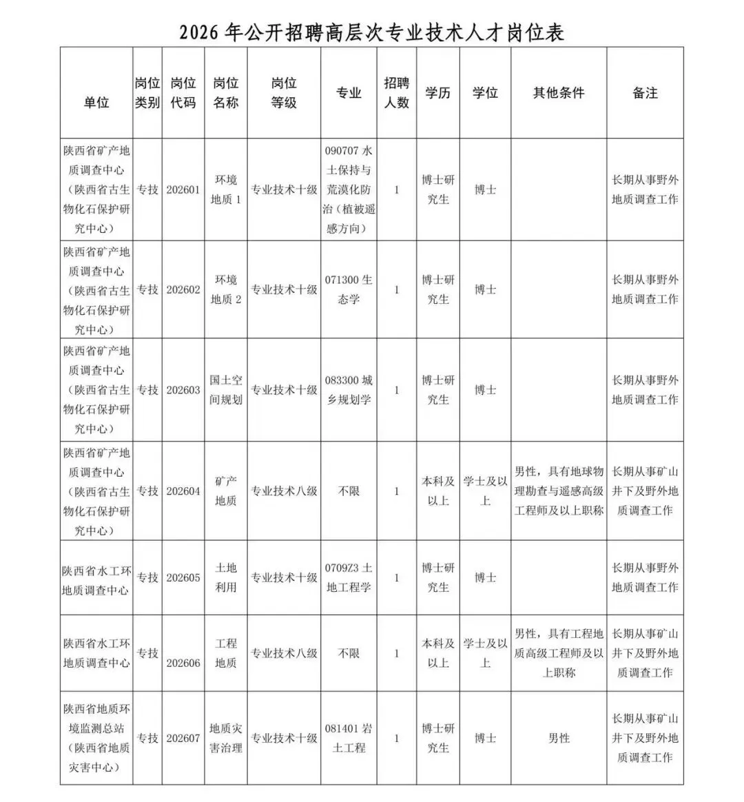 根据《事业单位人事管理条例》《陕西省事业单位公开招聘工作人员实施办法》等相关规定,陕西省地质调查院2026年公开招聘高层次专业技术人才7名。现将有关事项公告如下。