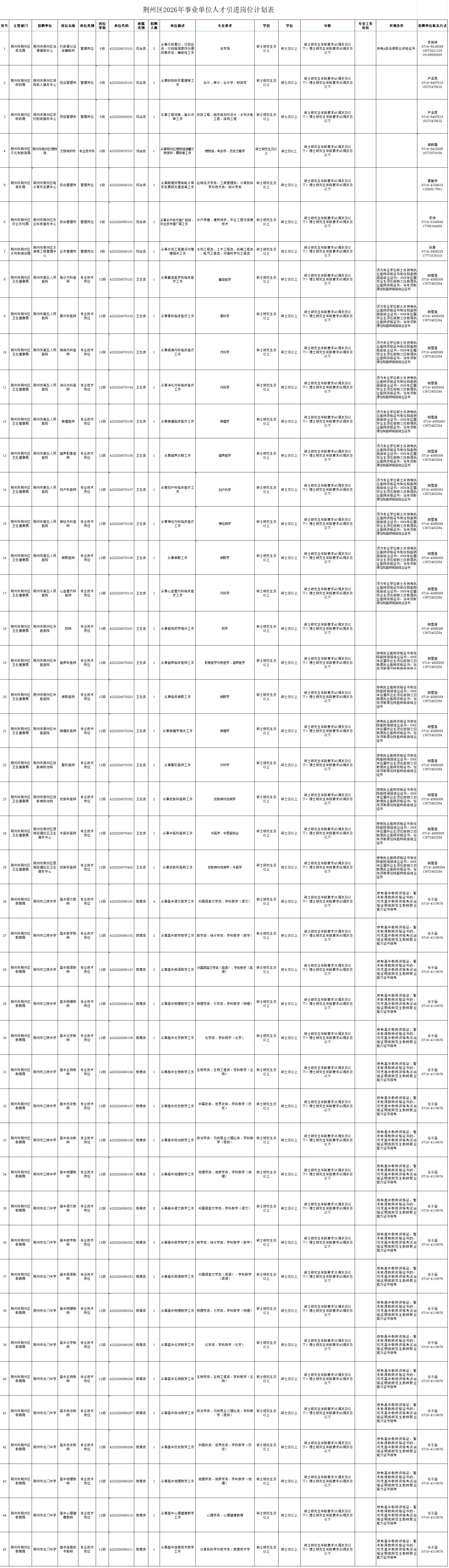2.荆州区2026年事业单位人才引进岗位计划表