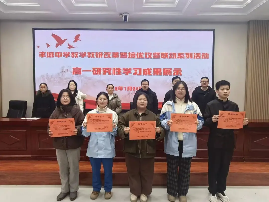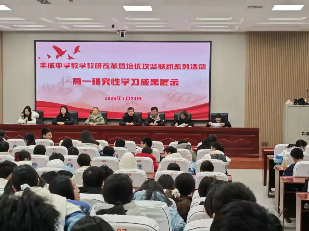 为深入推进素质教育,贯彻立德树人根本任务,助力江西省科技创新特色高中建设,2026年1月24日,丰城中学高一年级研究性学习成果展示活动在校1号阶梯教室隆重举行,丰飞武校长、刘强委员、陈鹤主任也莅临了活动现场。本次活动集中展示了一学期以来学生在教师指导下开展的各类课题研究成果,涵盖思政、数理、科技、人文四大系列,充分彰显了学校在培养学生创新精神、实践能力与综合素养方面的扎实成效。