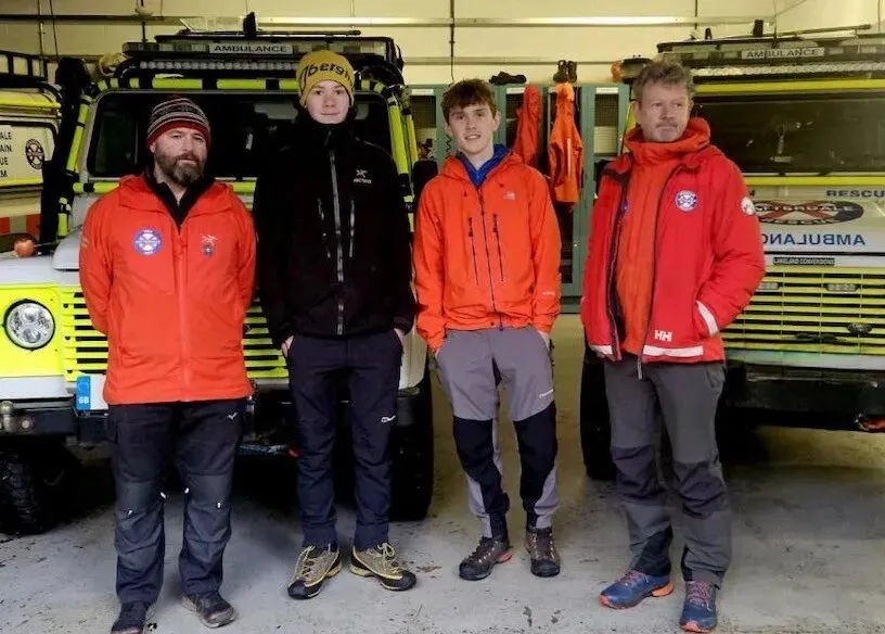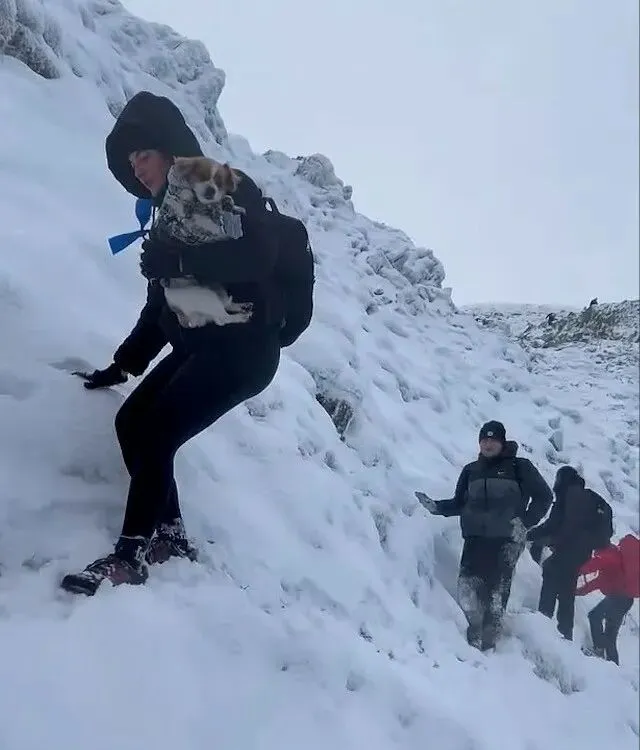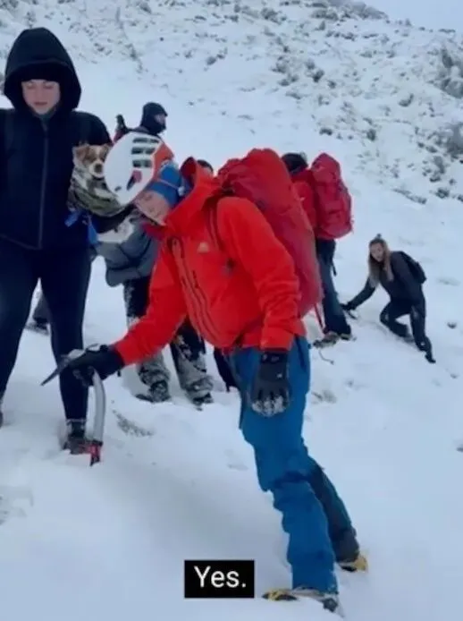 两人成功登顶后开始往下走,在经过赫尔维林山一个冰雪堆积的沟谷时,他们发现五个成年人被困在在一处瑟瑟发抖,其中一位女士怀里还抱着一条狗。