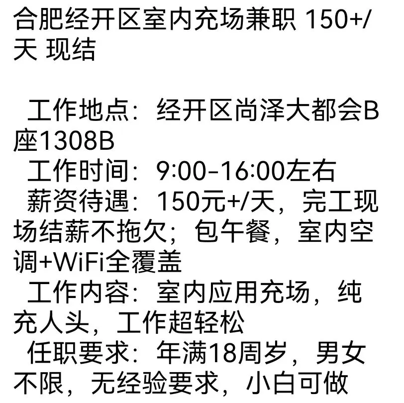【合肥兼职】150+/天,尚泽大都会,室内充场兼职