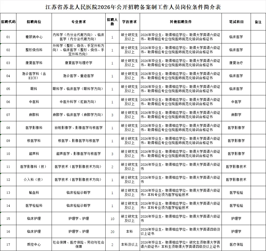 江苏省苏北人民医院 2026年公开招聘备案制工作人员公告