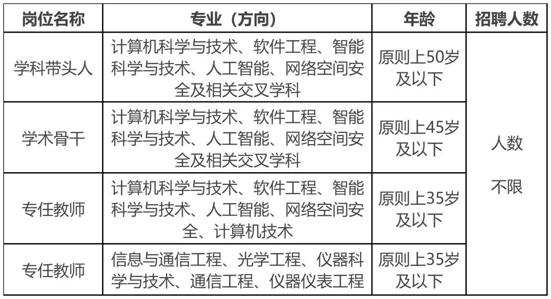 1)学科带头人:具有博士学位和正高级专业技术职务,或在海外高水平大学或科研院所具有副教授以上职务或其他相当职务,年龄原则上不超过50周岁,科研方向稳定并取得国内外公认重要研究成果,对本学科建设有创新构想和思考。