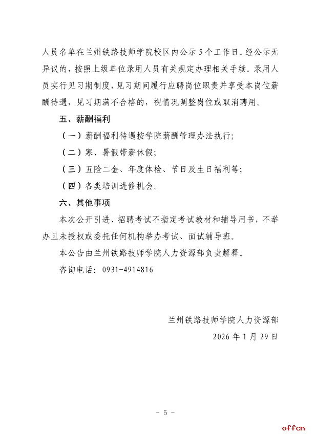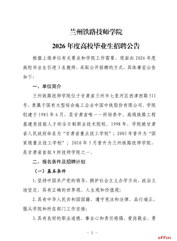 原标题:兰州铁路技师学院2026年度高校毕业生招聘公告