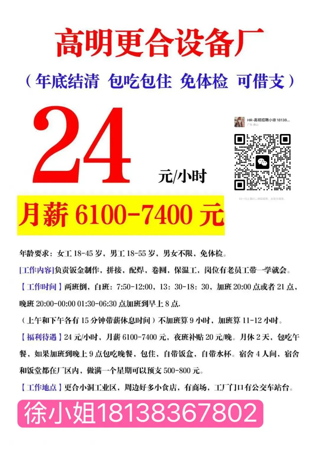 福利:包吃住(公寓6人间,空调热水器齐全,水电平摊),免体检、可借支