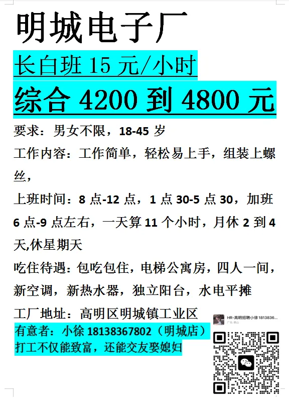 薪资待遇:17元/小时,两班倒,白班包吃两餐,夜班补贴15元/晚