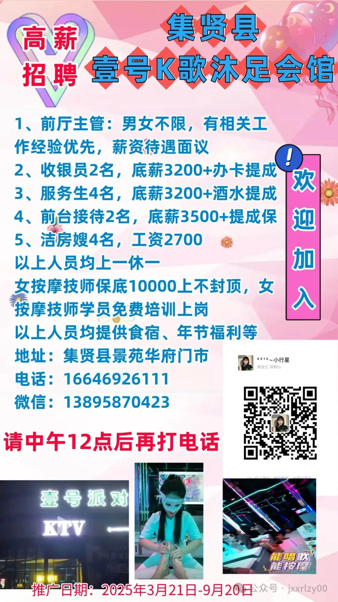 ⛳️集贤县壹号K歌沐足会馆招聘: