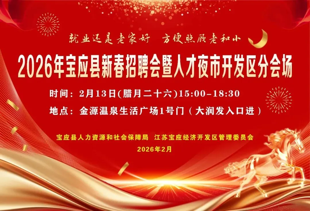 另外,宝应县人力资源和社会保障局将于正月初六上午8:30-12:00,在城南体育休闲公园篮球馆举办“宝应县2026年新春大型人力资源招聘洽谈会”,也期待您的参与。届时规模更大、岗位更多,覆盖全县需求,免费提供就业创业政策解读、法律咨询。