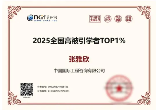 太赞了,TOP1% !公司青年科技人才实力登榜,这份荣耀超有分量!近日,中国知网(CNKI)发布“2025全国高被引学者”榜单。公司资源与环境业务部(碳达峰碳中和协同推进中心,以下简称“资环部”)青年员工、中咨卓越工程师学院培育的优秀人才张雅欣,凭借其在资源环境与“双碳”领域的亮眼研究成果,成功入选该榜单最高层级——“2025高被引学者TOP1%”。张雅欣作为公司自主培养、淬炼成长的青年科技人才,这份荣誉的获得,不仅是对其个人研究能力的高度认可,也是中咨智库学术影响力和社会影响力的有力彰显,体现了公司高端智库建设与青年人才培养的显著成效。荣誉证书