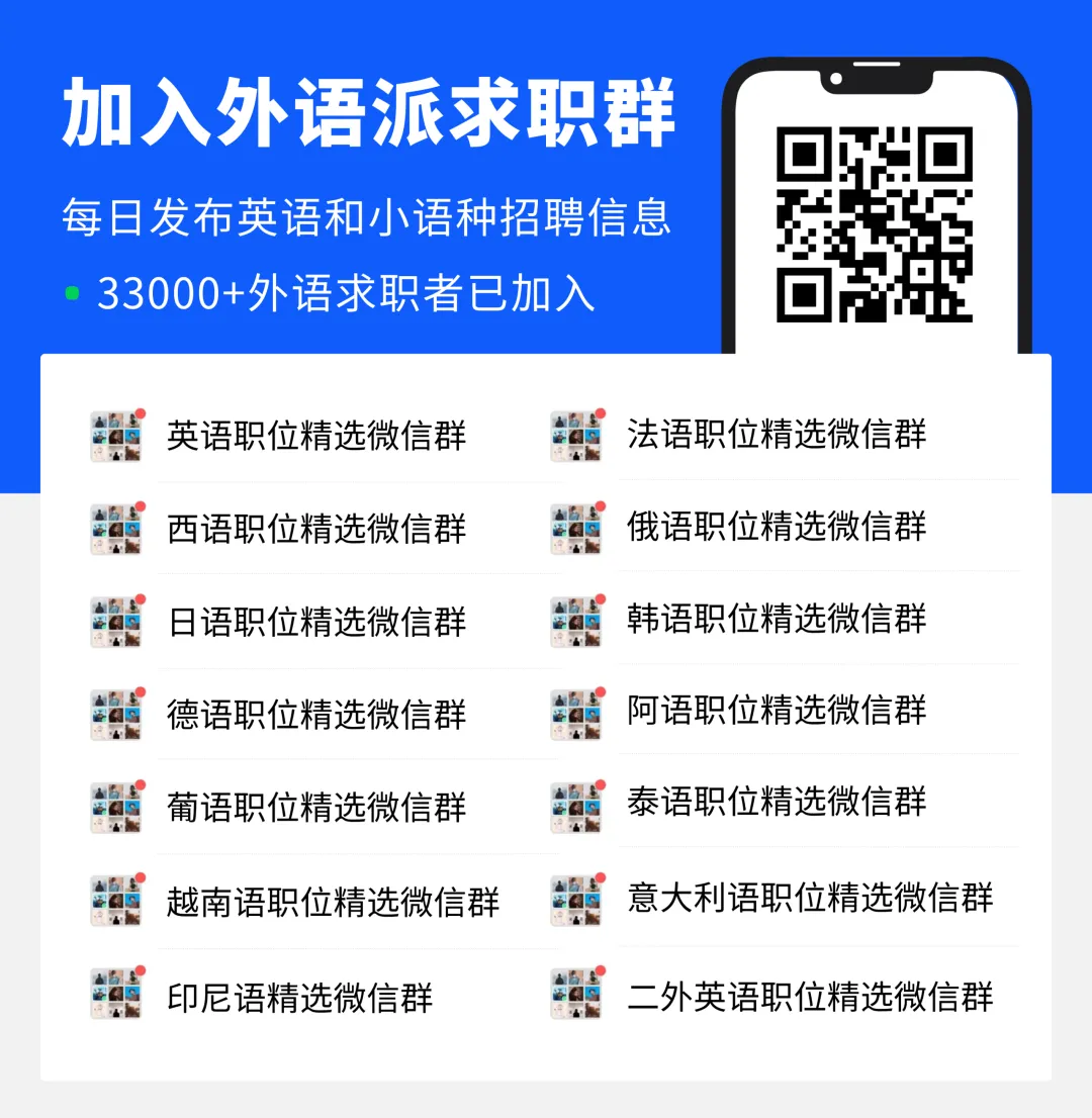 本公众号发布的所有招聘信息均来源于外语派招聘网站(www.waiyupai.com)、企业官方招聘平台、各高校就业网或公开招聘渠道。所有发布的招聘信息版权归原作者所有。我们尊重并保护知识产权,如果任何企业或个人认为我们发布的信息侵犯了其合法权益,请及时与我们联系。