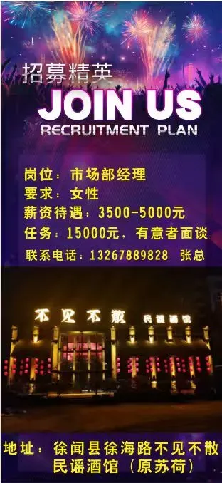 工作要求:男女不限,18岁以上,服从管理,有夜场相关工作经验优先。