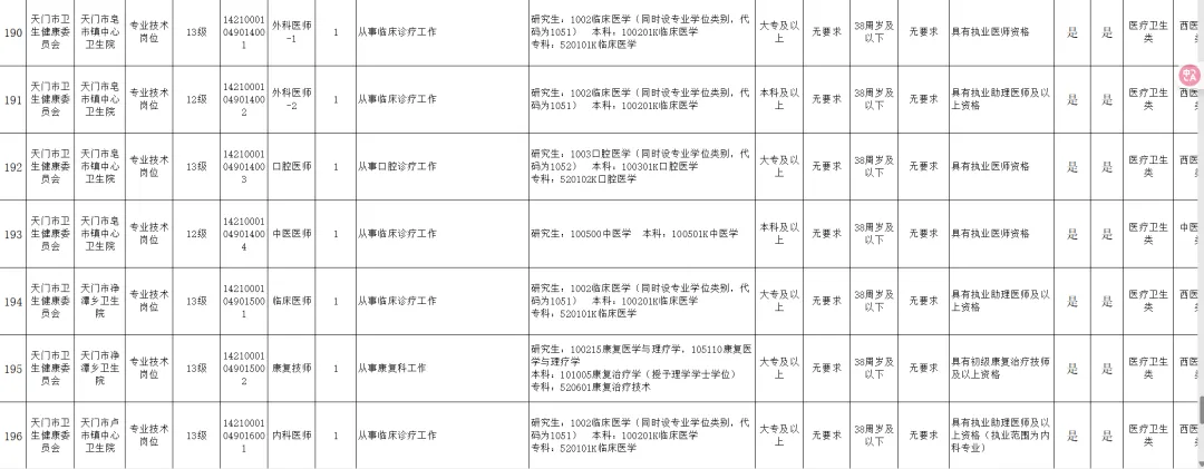 详见《天门市事业单位2026年统一公开招聘工作人员报考指南》(附件3)。对岗位条件相关问题可咨询招聘部门,联系方式见《天门市事业单位2025年统一公开招聘联系咨询方式一览表》(附件2)。