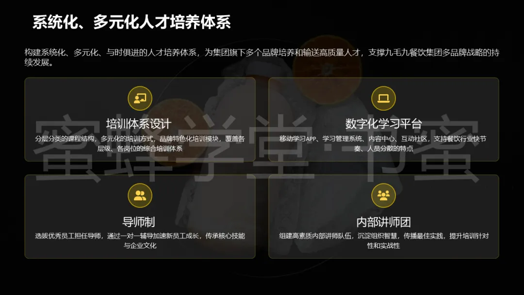 比如:为持续给各品牌输送合格人才,九毛九集团构建了覆盖基层员工、储备干部、中层管理到高层管理者的四级人才梯队。