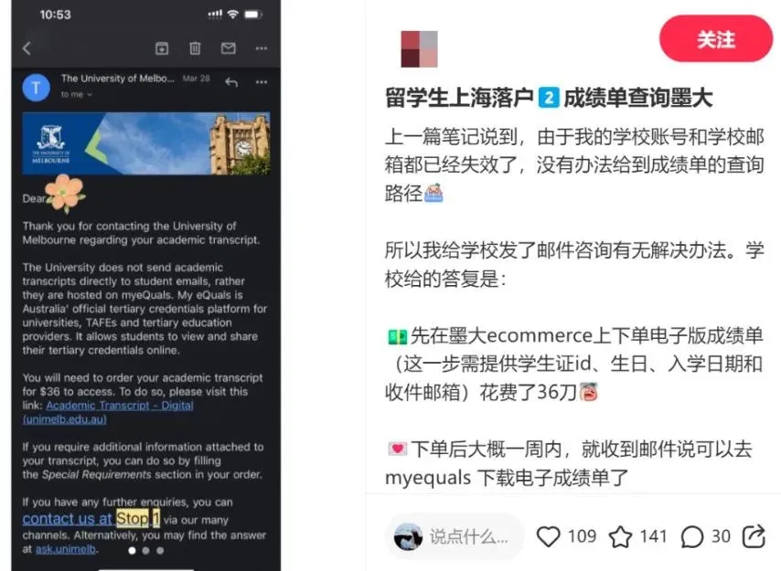 这就意味着无法查看之前学校发送重要通知和文件,比如成绩单、毕业证原件、COE等。