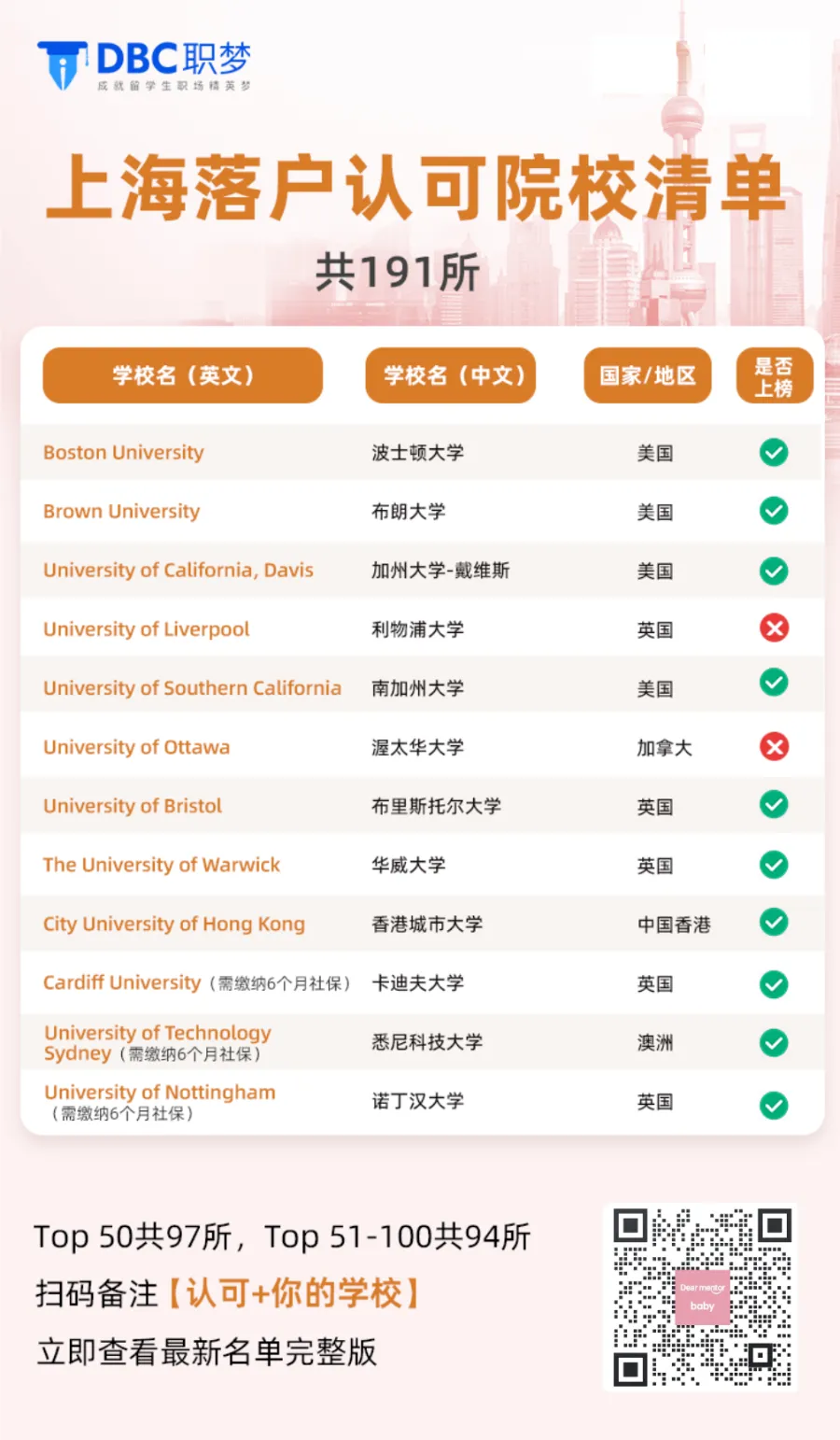 馒头一一核对名单后发现,今年放宽后比去年多了32所,一共有191所院校上榜,其中:🔴Top 1-50共97所(43所美国大学,10所英国大学)对比其他城市,上海落户显然给了留学生更多机会。无论是选校申学or归国就业,都只能按官方公布的名单来对照检索自己的院校是否有资格👇。