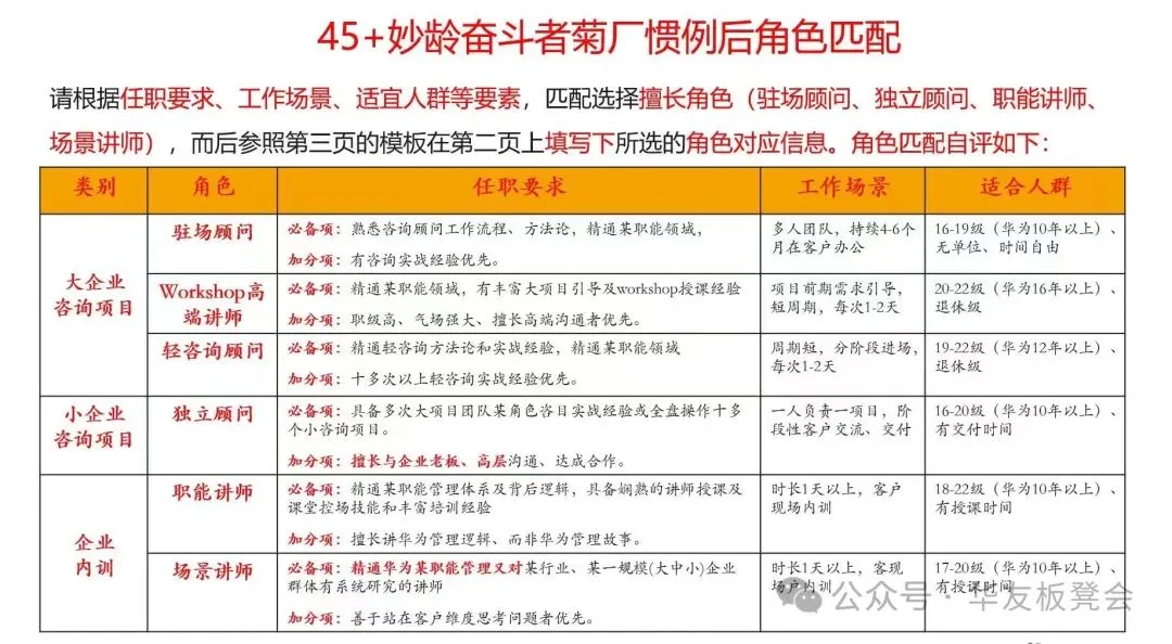 对职位明白:对自己的职场第二春明白,对自己擅长的岗位职责要求、能力要求了解清楚,对职位所需的华为经验体系与逻辑清晰。