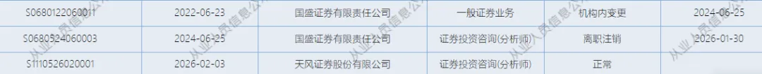 近日,证券从业系统显示张国安,1月30日从国盛证券离职,2月3日加入天风证券。张国安,国盛证券金融工程团队分析师